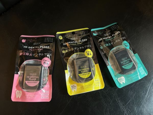 ドクターオーラルから登場した「3Dデンタルフロス」は真っ黒の吸着効果に優れた炭を配合している。炭の吸着で隠れた歯垢をしっかりとからめとってくれるのだ。フロスが黒色だから、歯垢が目に見え効果を実感しやすい特徴がある。フレーバーも3種類。好みのフレーバーに合わせて毎日フロスするのもいいのではないだろうか。