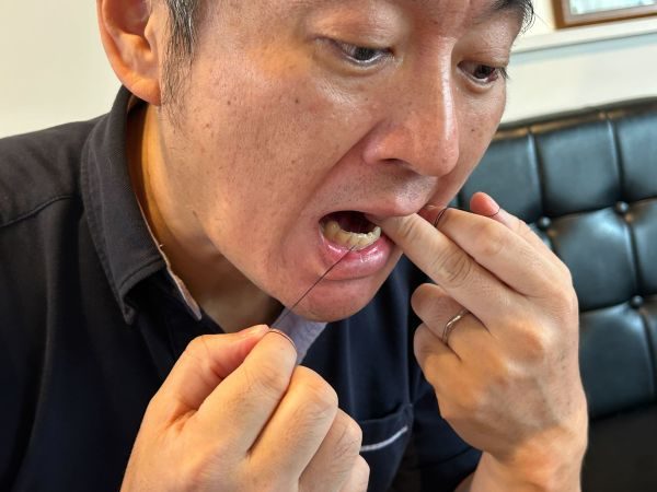 長さは50Mあるのでなかなか大容量。40cmほどフロスを取り、歯と歯の隙間にフロスを通していく。水を含むとフロスが口の中で膨らみ、独自の伸縮性のあるウェーブ繊維が歯茎の中で優しく広がっていく。隠れた歯垢を優しく絡めてくれるのだ。