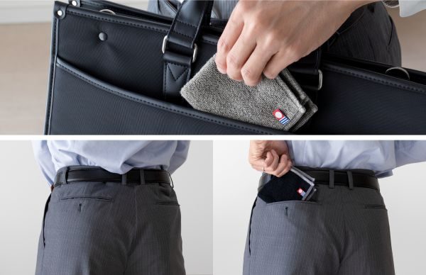 約20cm角の小さなサイズで、ポケットやバッグにもすっきり収納。スーツのシルエットを崩さずにスマートに持ち歩けるのではないだろうか。