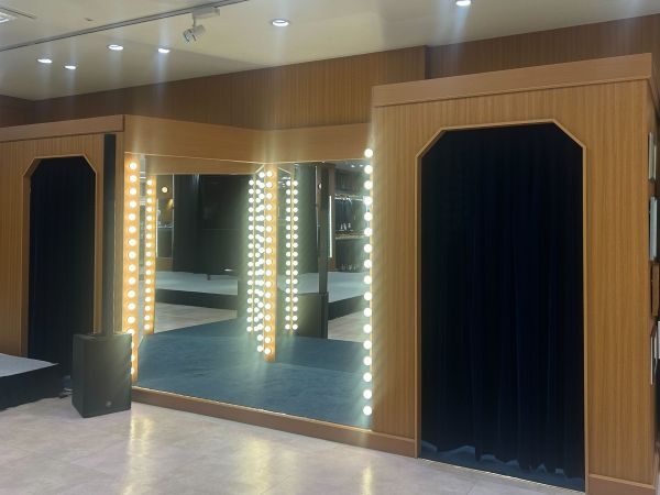 全身スタイリングが確認できる三面鏡のあるフィッティングルーム前。大切な1着をゆったりと落ち着いた雰囲気で選んでいただける空間となっている。