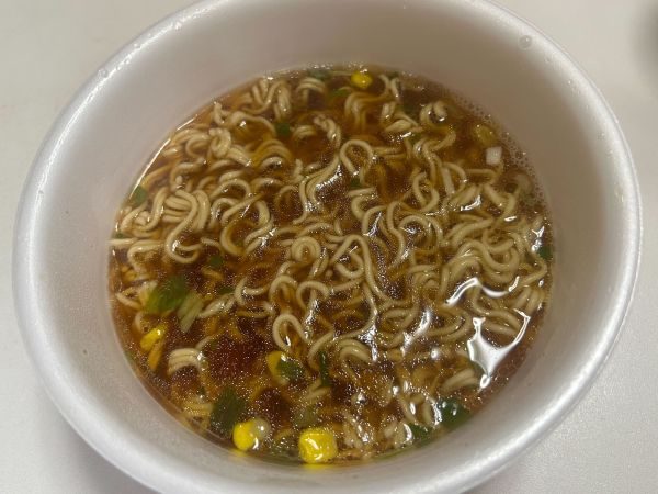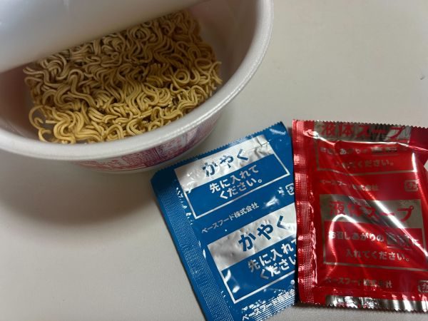 お湯を入れて4分。液体スープを入れる。よくかき混ぜて完成。いつでもどこでも美味しくいただけるのは素晴らしい。