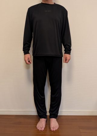 パジャマとは異なっていて、さらっとしている肌触り。締め付けがないのでストレスフリー。実際に着用して寝てみると本当に暖かい。私のベッドは窓際にあるので、掛布団は少し厚めの羽毛布団を使用しているのだが、それだと暖かすぎるくらいに感じる。これが遠赤外線の効果なのだろうか。明け方の暖かくなる時間帯は布団がめくれていることもしばしば。